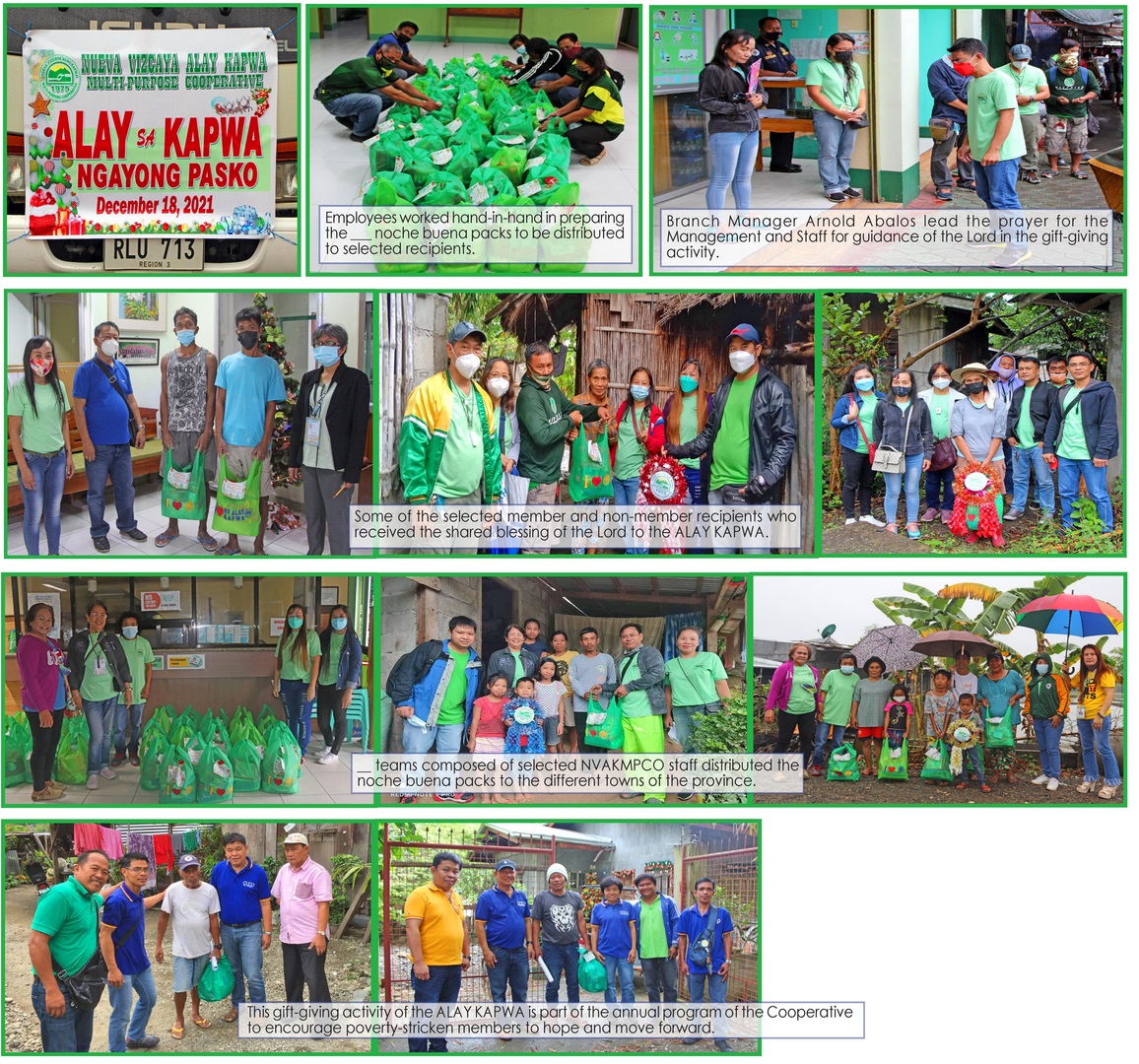 Every Christmas, the Cooperative conducts gift-giving activities to less fortunate members of the Cooperative. For this year, the ALAY KAPWA identified ___ member-recipients from selected brangays in the different towns of Nueva Vizcaya and included ___ non-members who have been challenged by the effects of the pandemic. The ALAY KAPWA prepared P500 worth of noche buena packs and 25 kgs of rice and was distributed by the Managment teams to each of the recipients. During the pandemic in 2020, the activity was not conducted due to restrictions in quarantine rules. However, in 2019, the same noche buena packs were also prepared by the Cooperative and was distributed by the Officers and Management teams to ___ recipients.