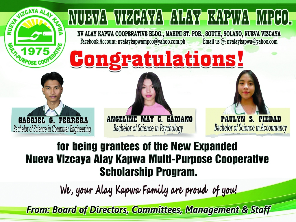 Part of the commitment of the NVAKMPCO to social responsibility is to serve as platform for free education of exceptional students through receiving financial and related support under the New Expanded NV Alay Kapwa MPCO Scholarship Program.