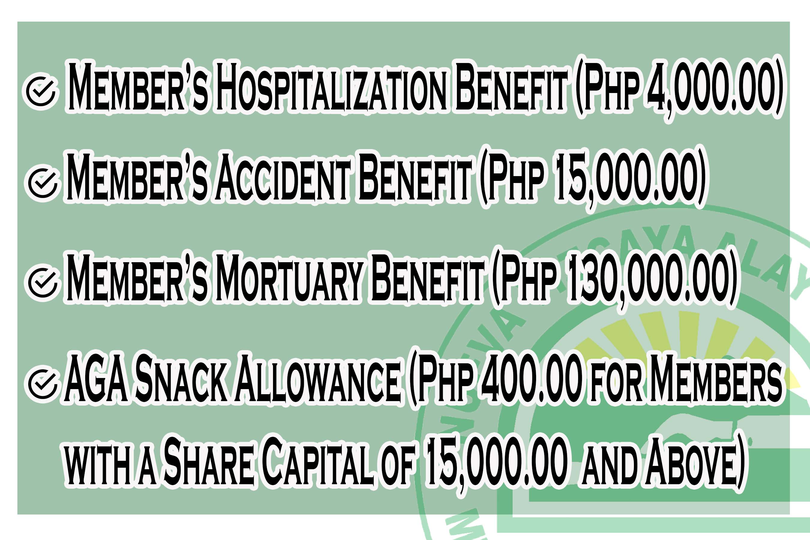 - Assistance of 2,250-3,000 aside from hospitalization benefit if hospitalized. Amount shall be based on paid-up Share Capital.