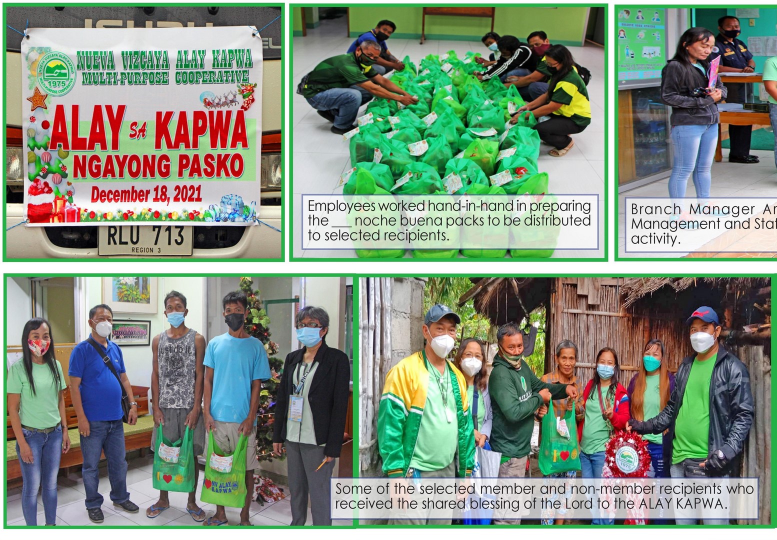 Every Christmas, the Cooperative conducts gift-giving activities to less fortunate members of the Cooperative. For this year, the ALAY KAPWA identified ___ member-recipients from selected brangays in the different towns of Nueva Vizcaya and included ___ non-members who have been challenged by the effects of the pandemic. . .... |